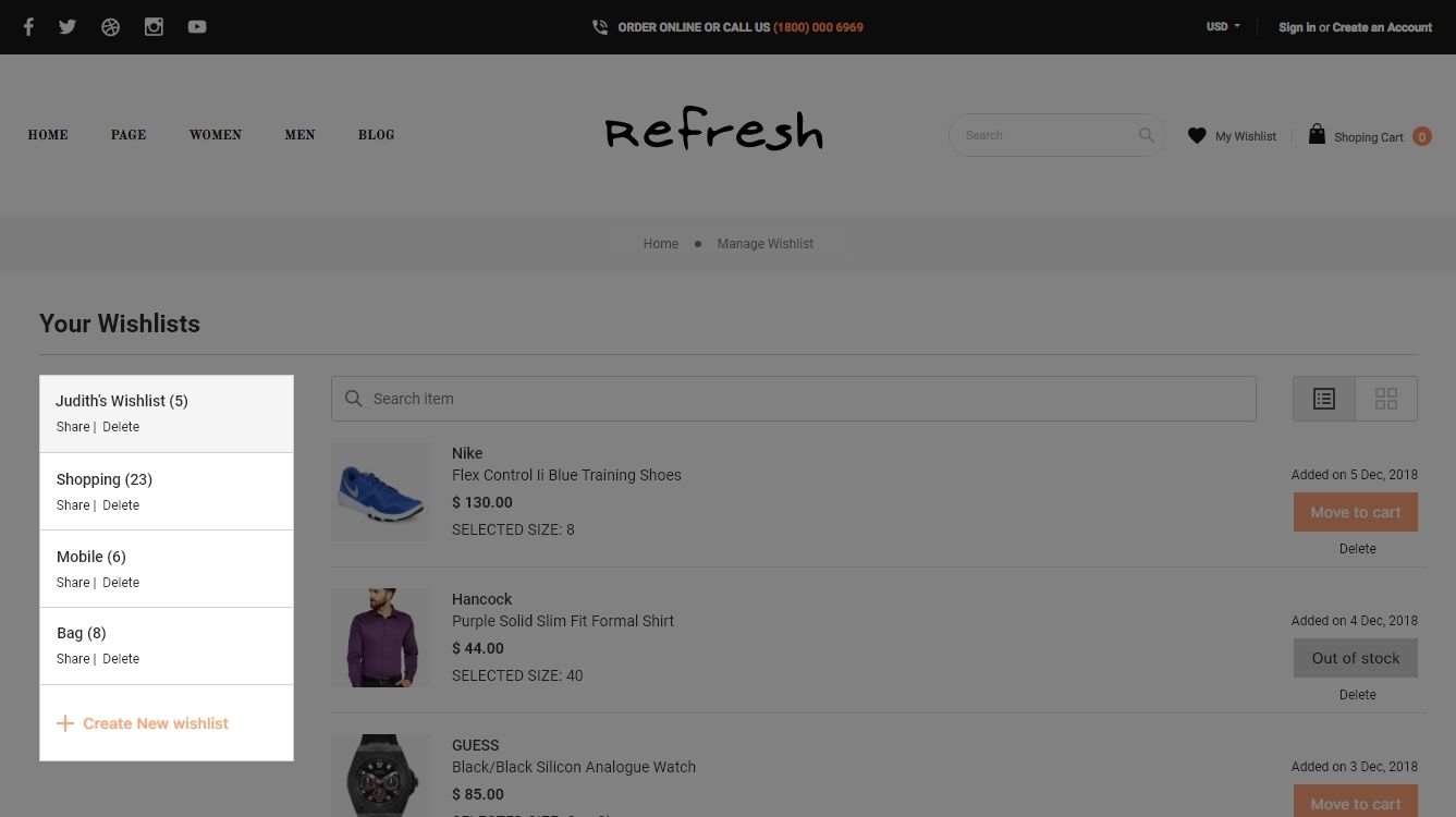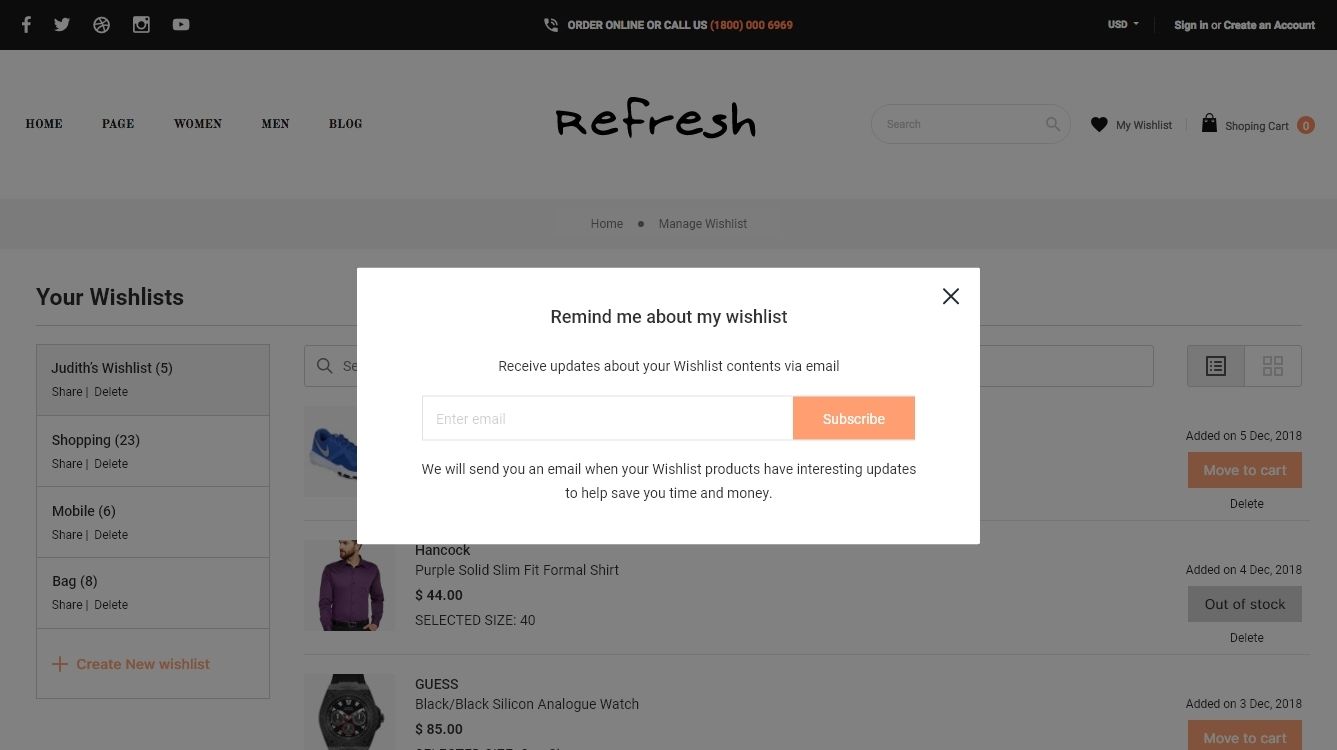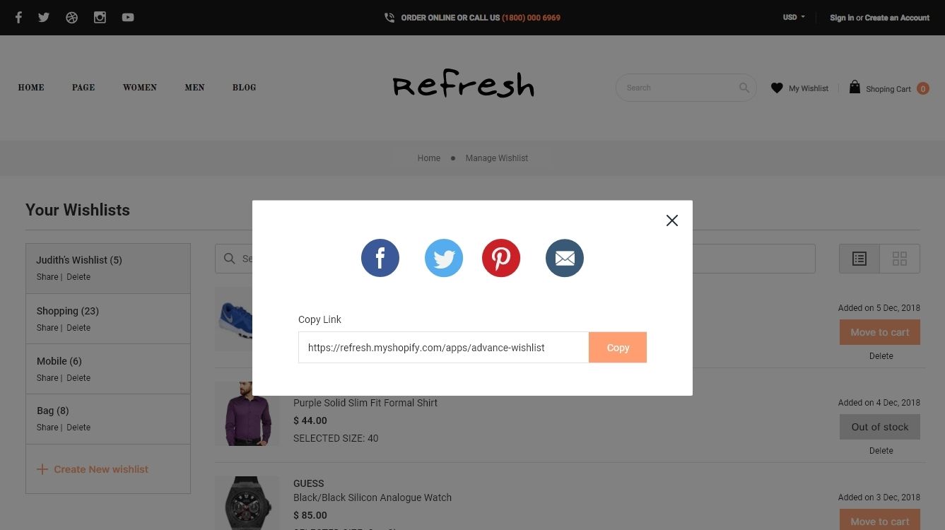 The store admin can enable shoppers to share the wishlist via email, social media, or a unique link by allowing the share to Wishlist option.
