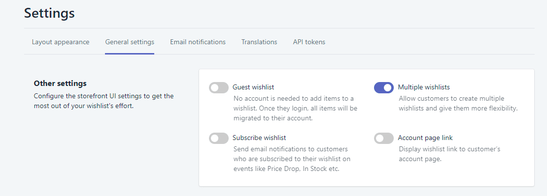 We have already implemented the “Multiple Wishlist” feature in our application. To enable this feature and provide your customers with the ability of multiple wishlists head to the application Settings tab > General settings > Enable the feature: