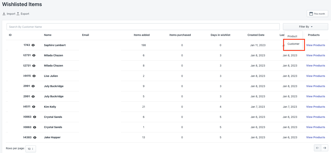 This feature is possible and you can find it following these steps: please head to the app > click on "Wishlist" > On the right side is located"Filter by the button": https://d.pr/0WmnKQ > click on this button > select customer.