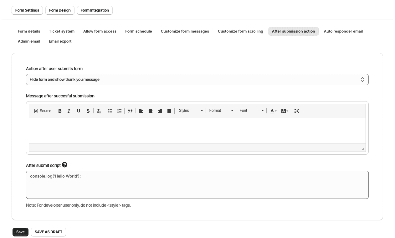 5. Under “After Submission Action” you can configure what happens after the form is submitted.