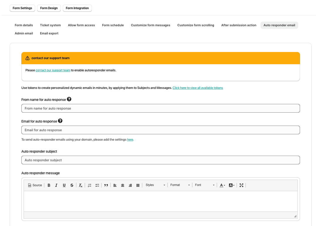 Users can add/edit the "Auto Responder" email address along with its "Subject", "Body Text" and "Footer Message". An additional option "Include user's response in auto-responder email" is also added here. By checking this option your customer will receive a copy of their submitted form.