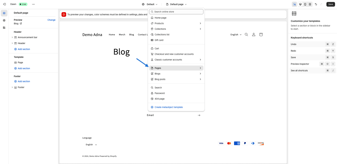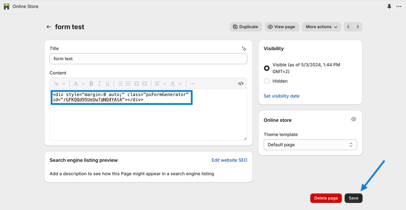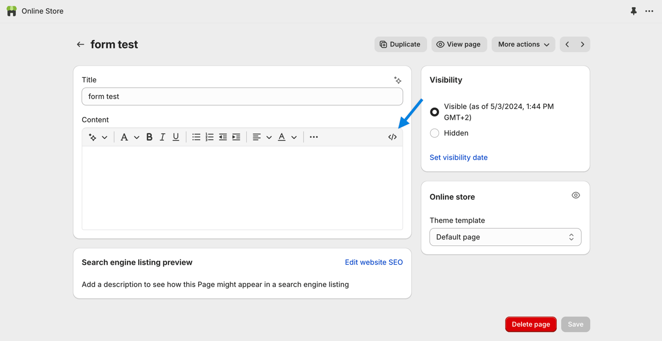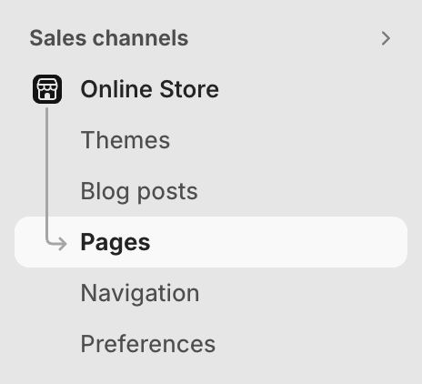 6. Navigate to Online Store > Pages and create a new page 'OR' choose an existing page on which you would like to place the form.