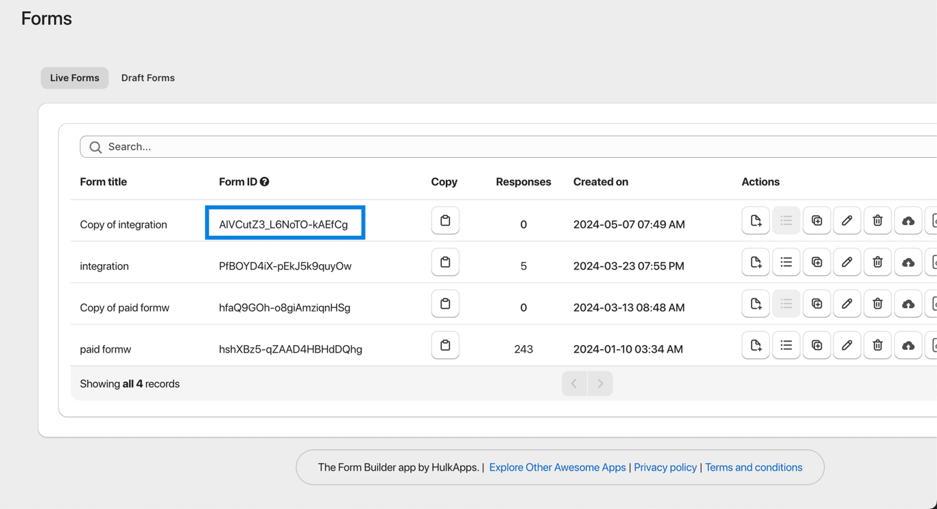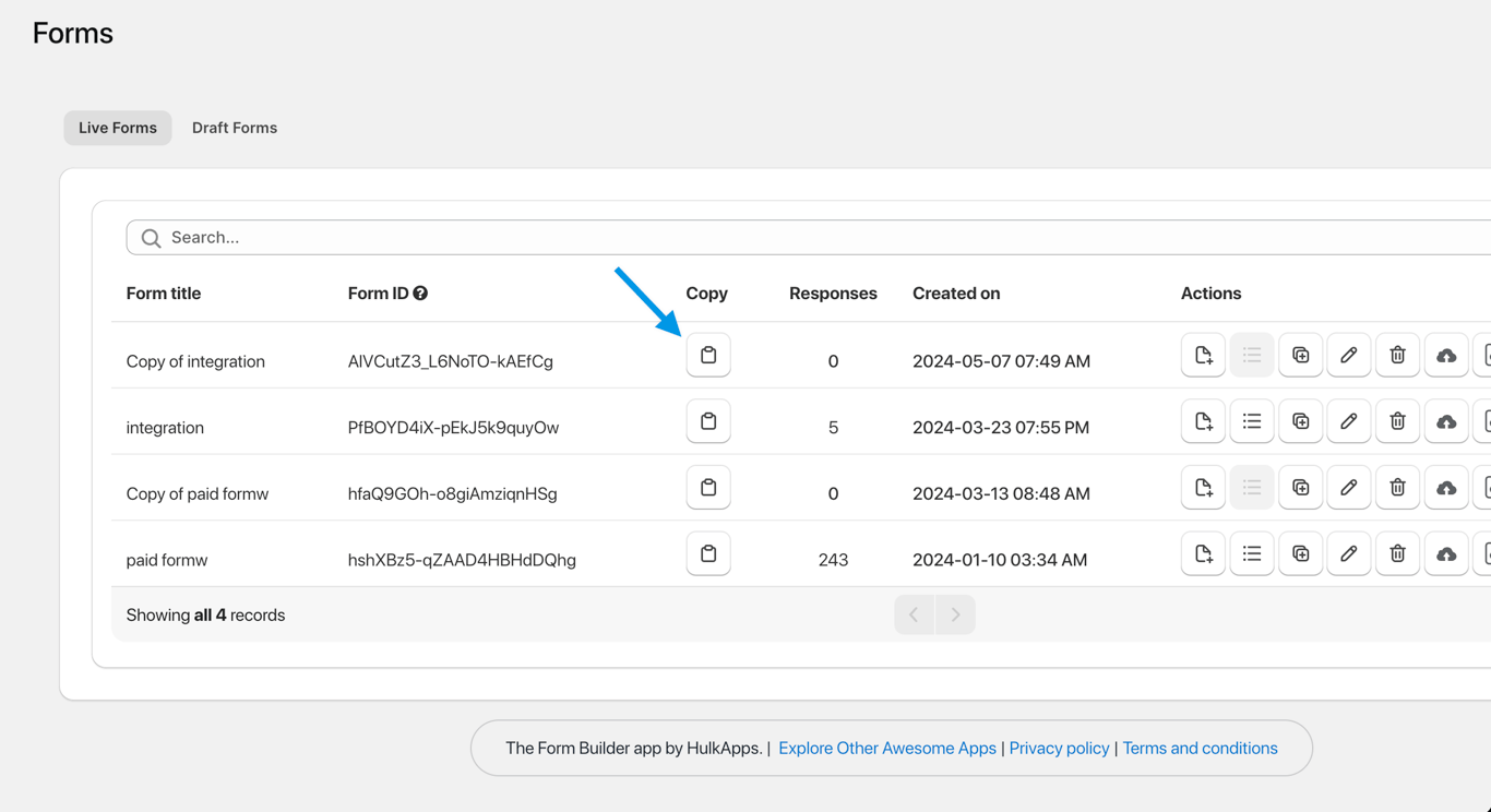 Click on the Forms button to view the list of the existing forms that you have created within the app.