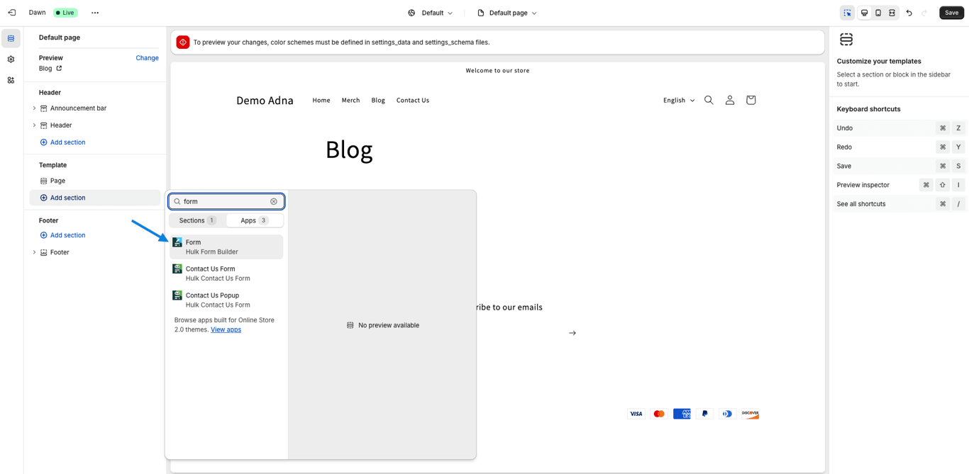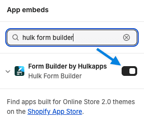 2. Click on the App embeds tab on the left side of the page under the Theme settings block and enable the Hulk Form Builder option and Save the settings.