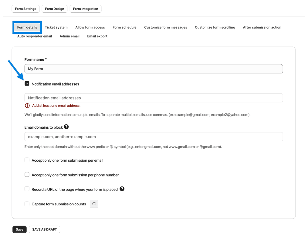 Store admin can get notified of submission whenever users submit a form. Multiple email addresses can be added in case you need multiple users to be notified. To separate multiple emails, use commas. (ex: example@gmail.com, example2@yahoo.com)