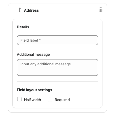 The Address element allows users to enter their complete address, including street, city, state, and postal code. It is useful for shipping information, billing details, or location-specific data.