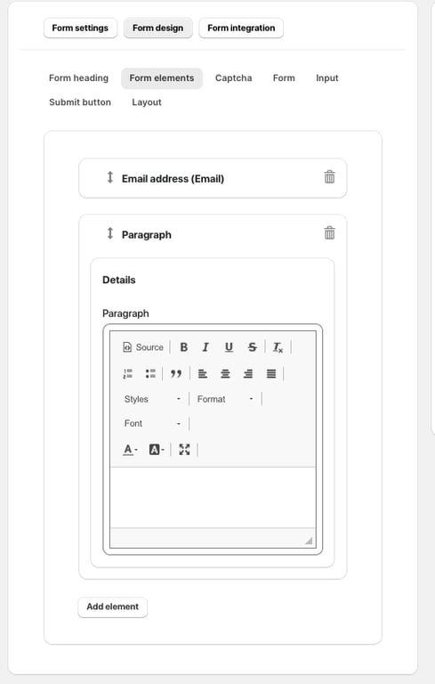The Paragraph element is used to add text anywhere in your form — for example, to include instructions, descriptions, or additional information for users.