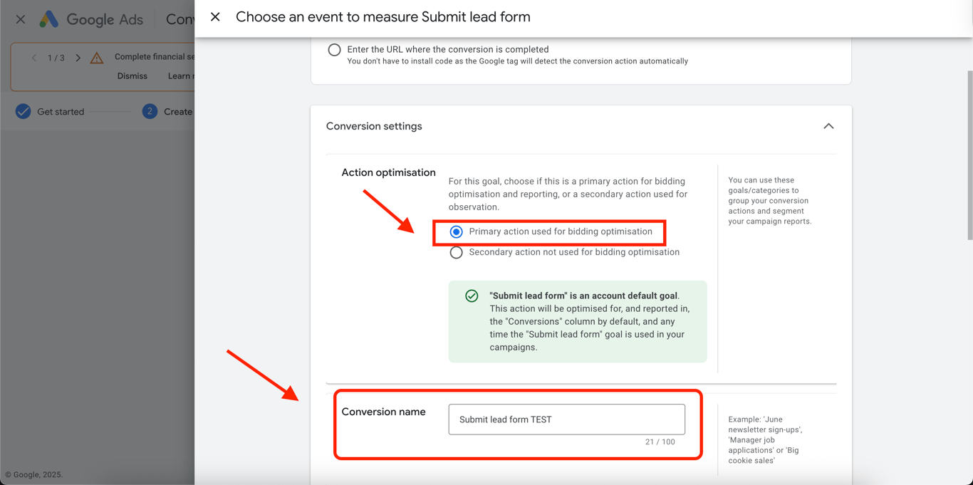Select the Primary action used for bidding optimisation to make your conversion action primary