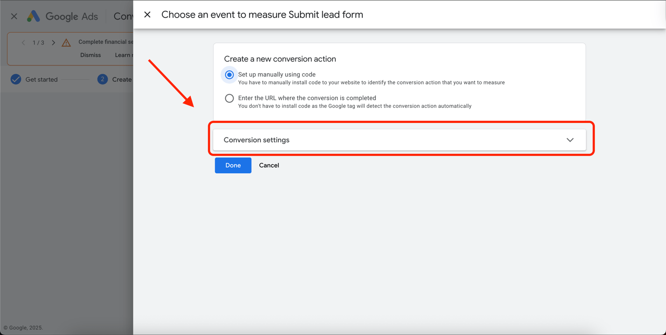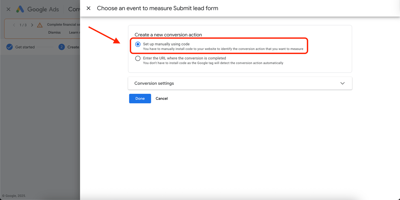 Select Set up manually using code to create a new conversion action