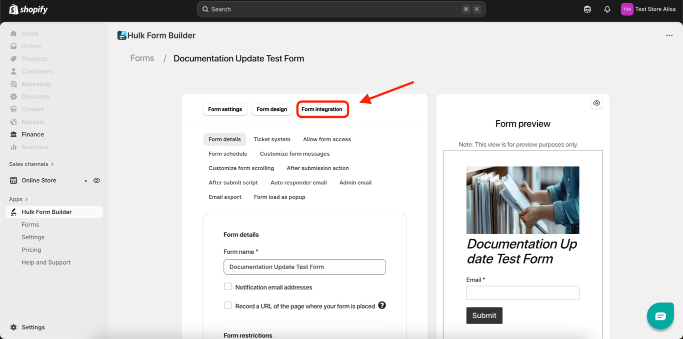 Click on the Form integration button