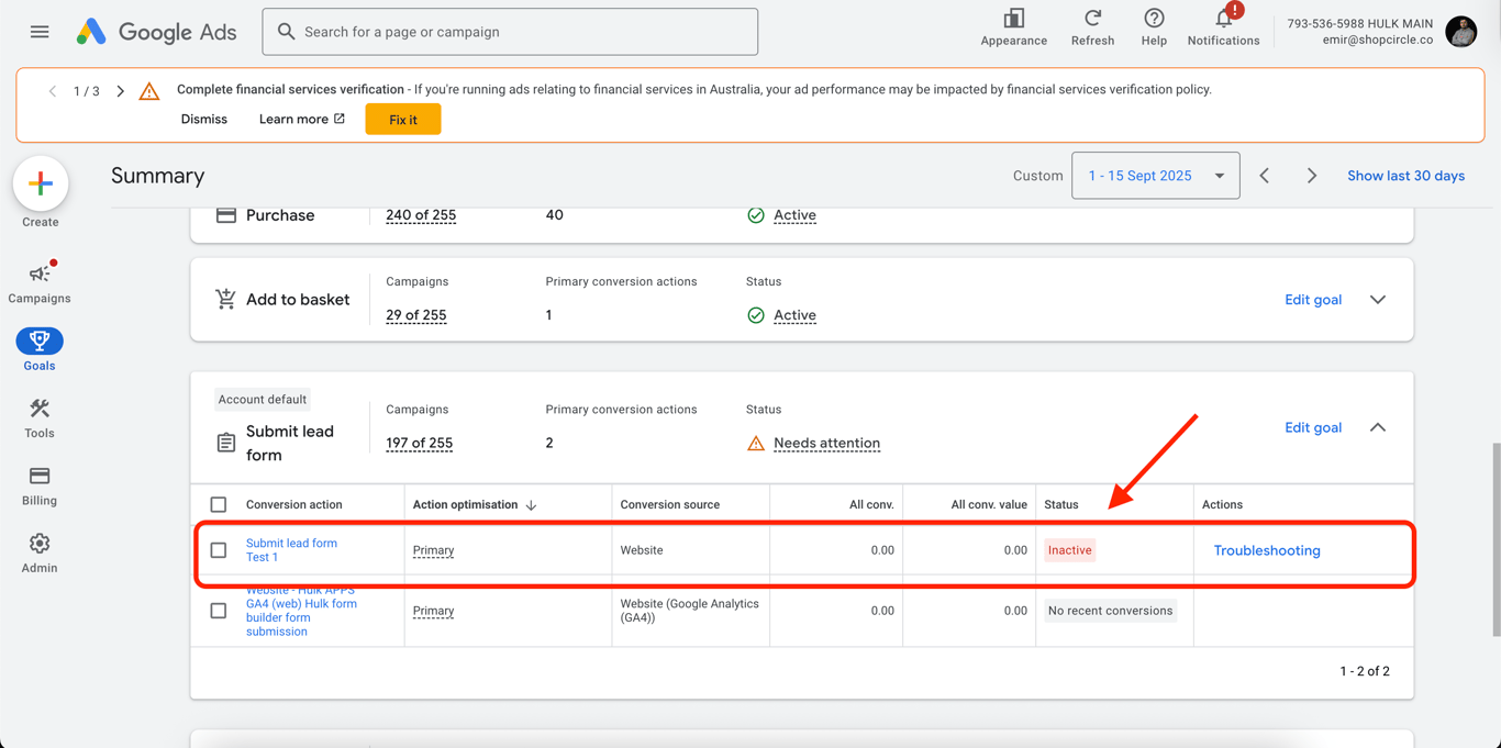 As a best practice, fill out your form on your website 5 to 10 times. This will help trigger your conversion goal, and within a couple of hours, the status will change from inactive to active