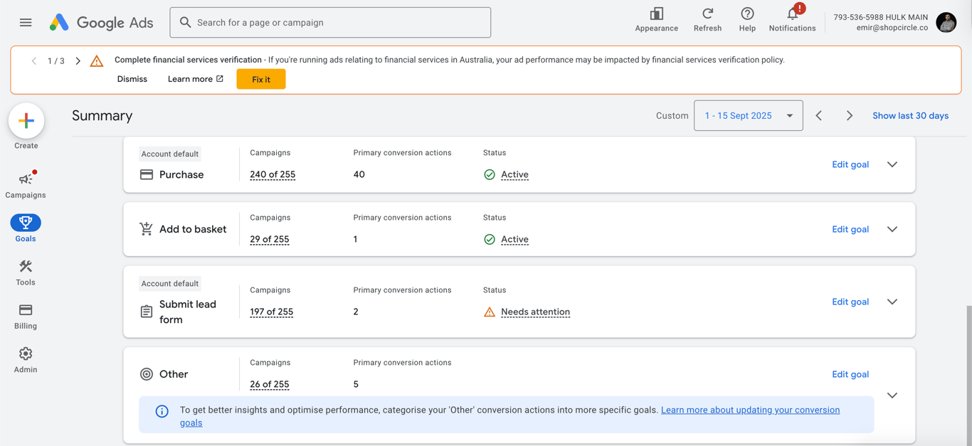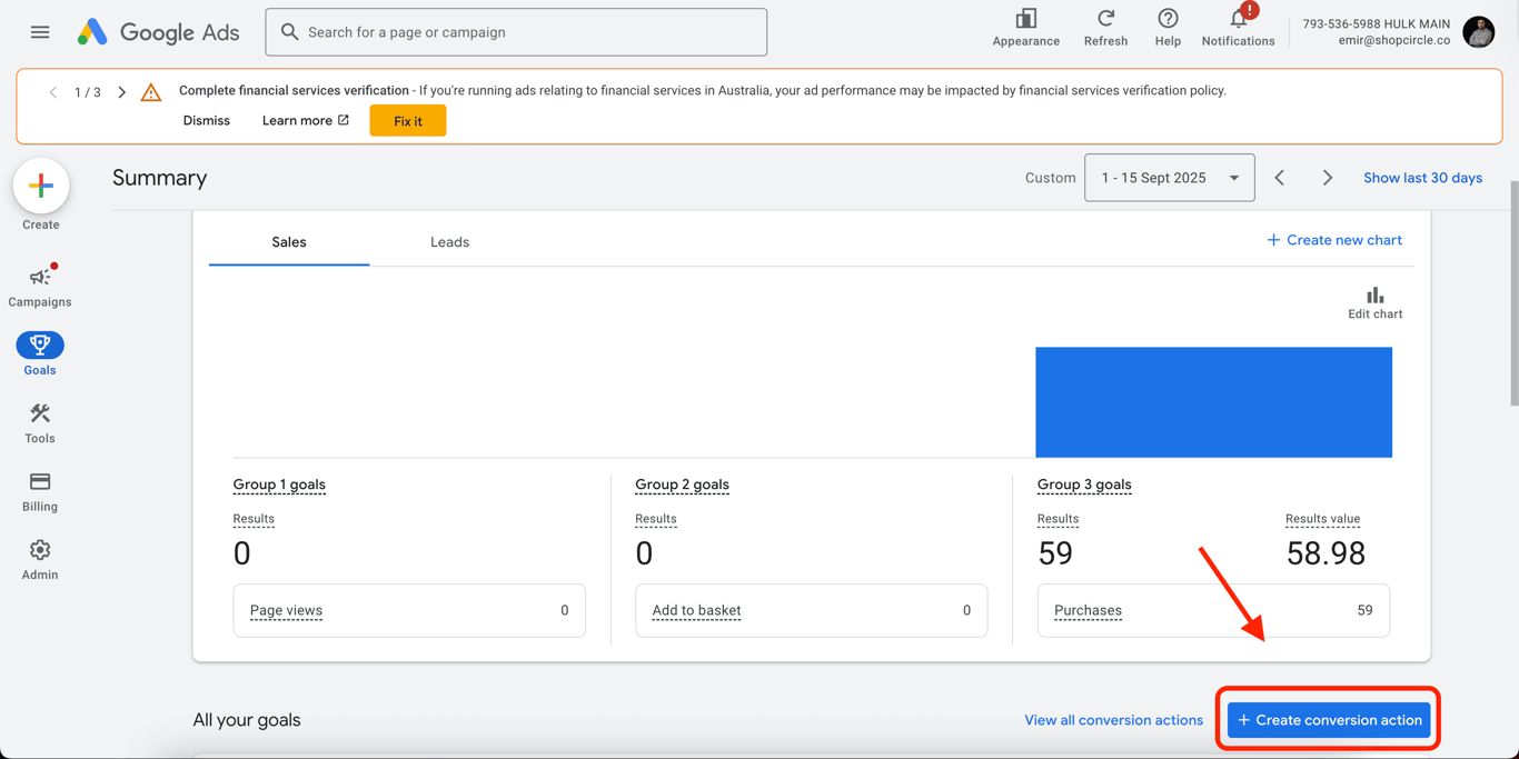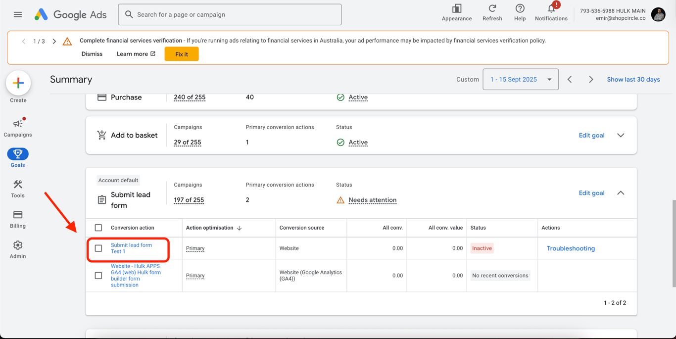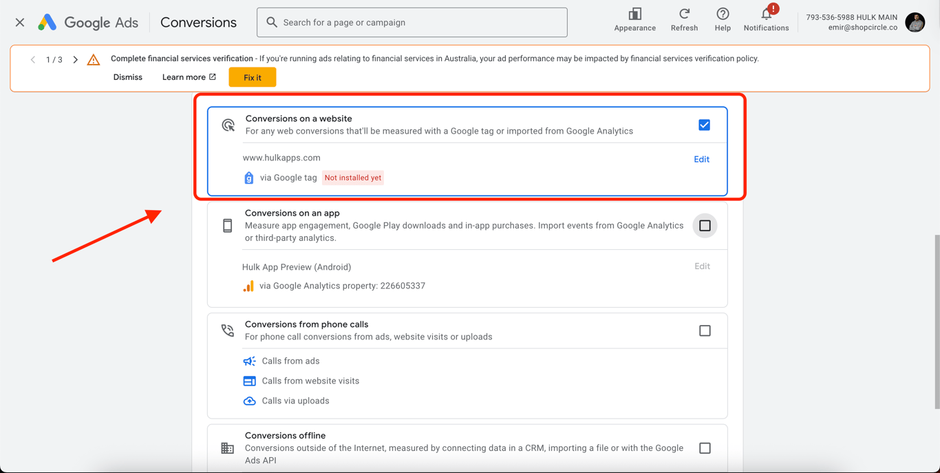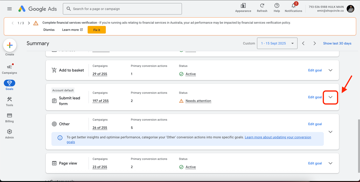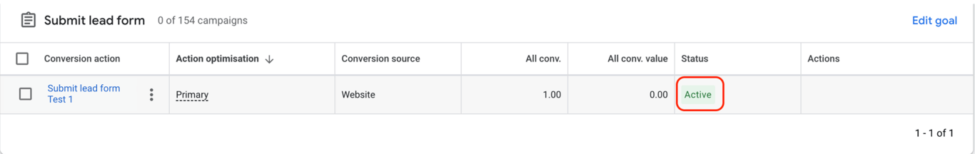 Click the arrow icon next to the goal to expand it and view the details of your conversion action.