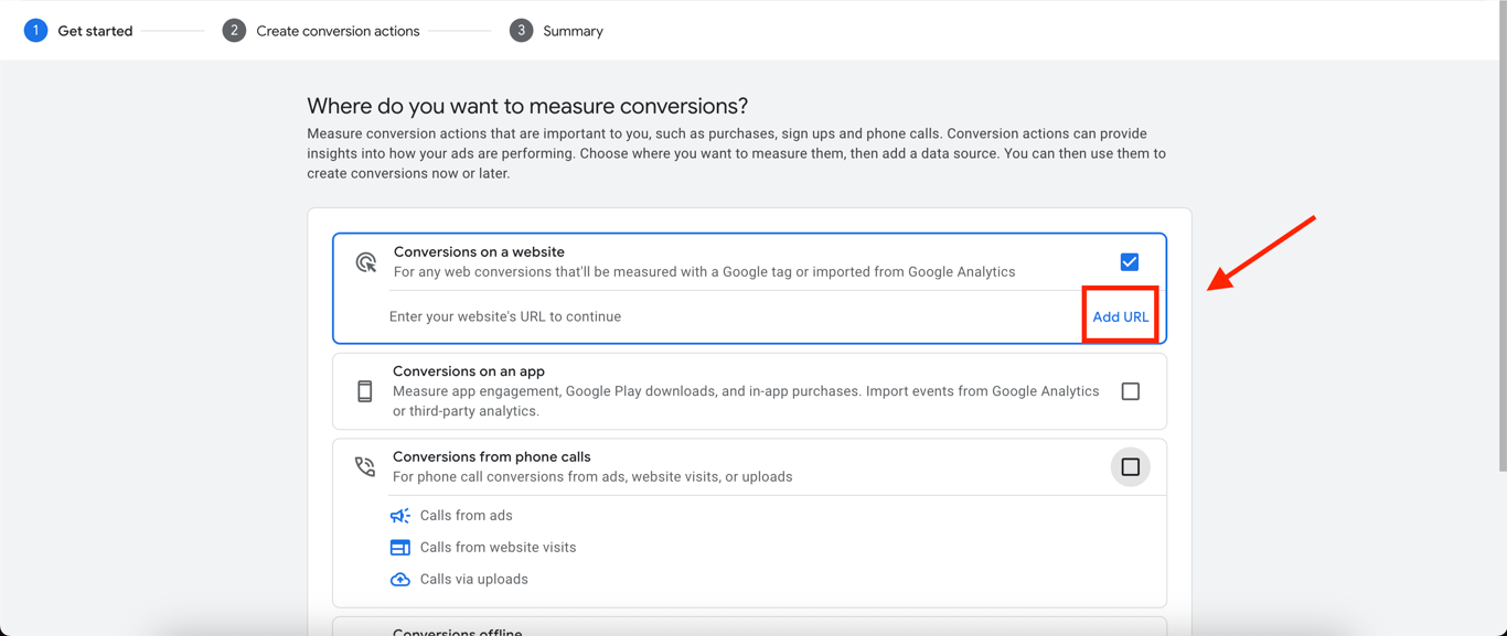 Choose Conversions on a website as your conversion action