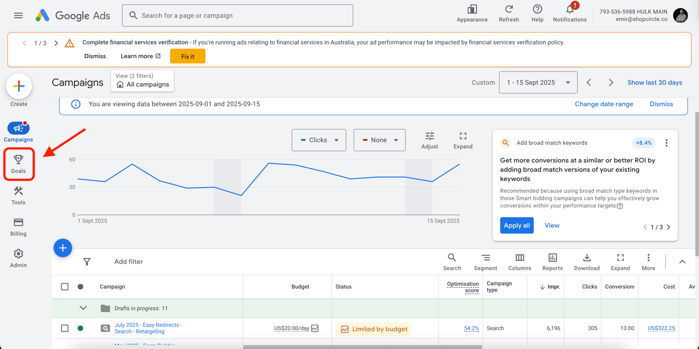 Click on the Goals icon on the left side of the page
