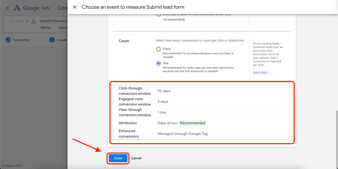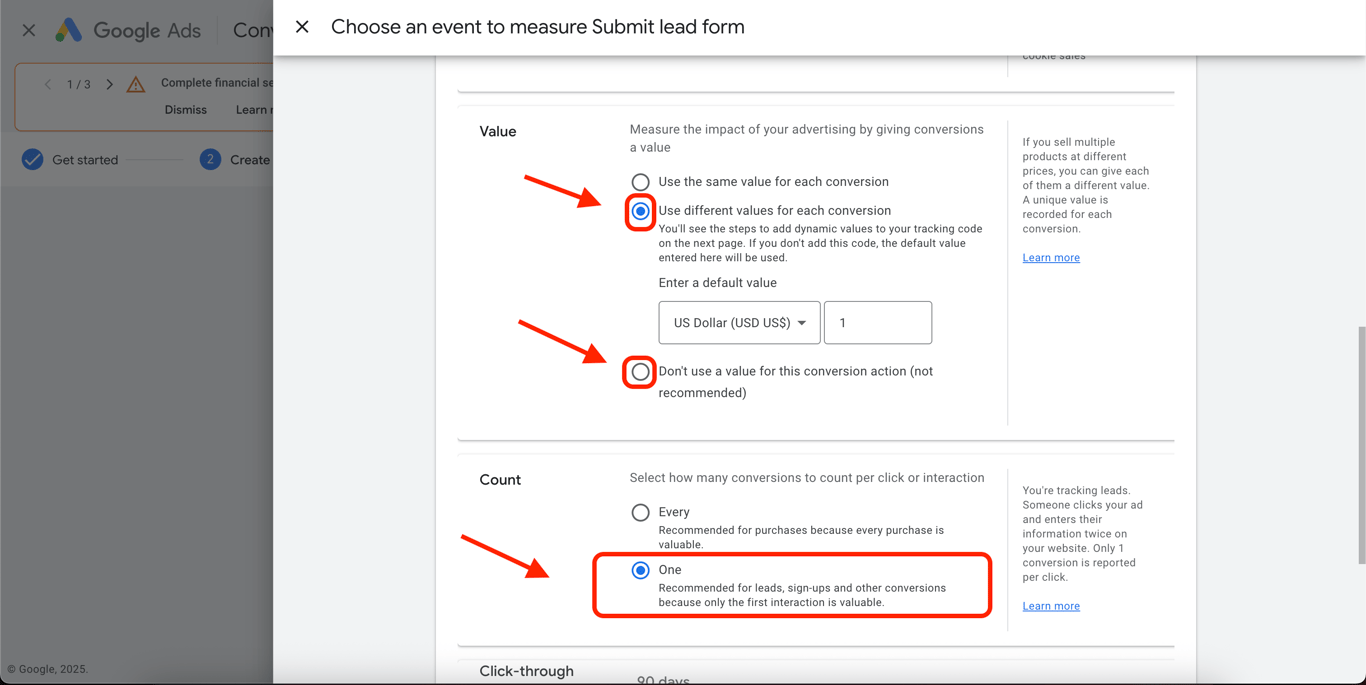 In the Count field, select One (recommended for leads, sign-ups, and forms).