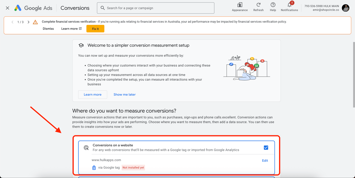 Important: Before creating conversion actions, ensure your Google Tag is properly set up to connect Google Ads with your Shopify store. To do this, install the Google & YouTube Sales Channel app from the Shopify App Store and follow the steps to link your Google Ads account.