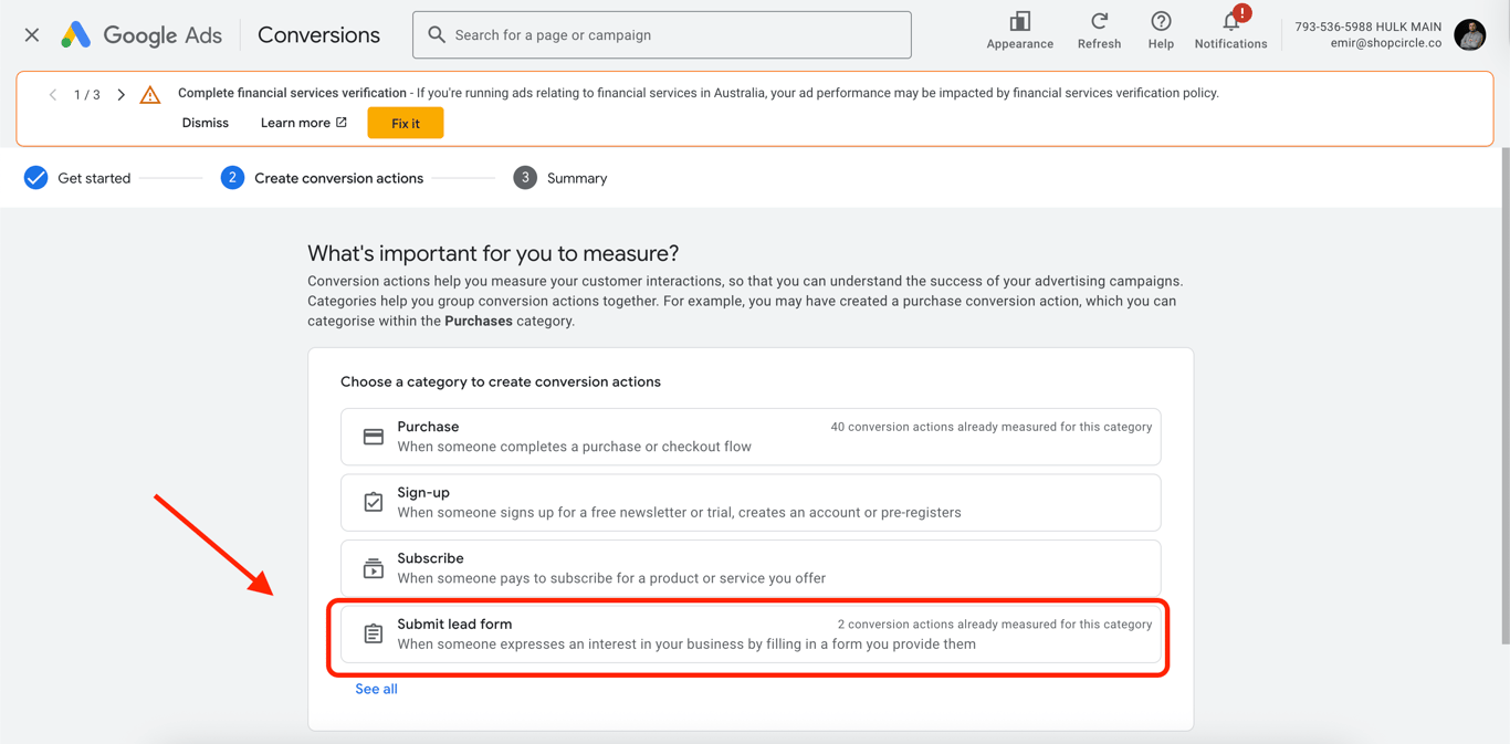 - Choose the Submit Lead Form category to create conversion actions