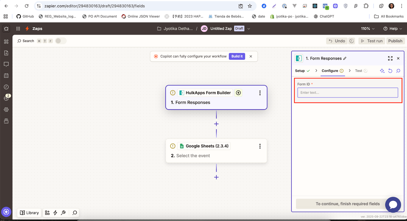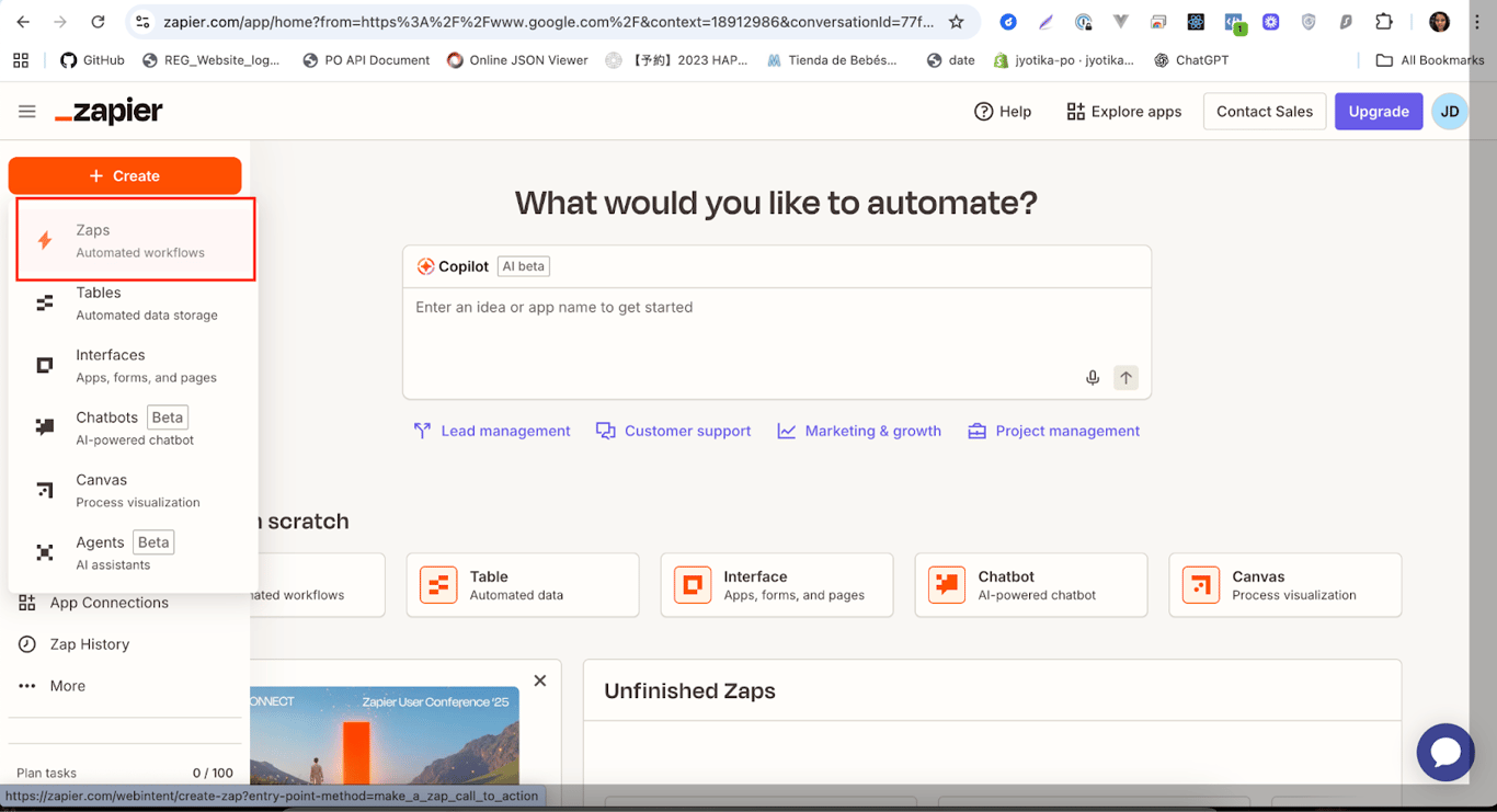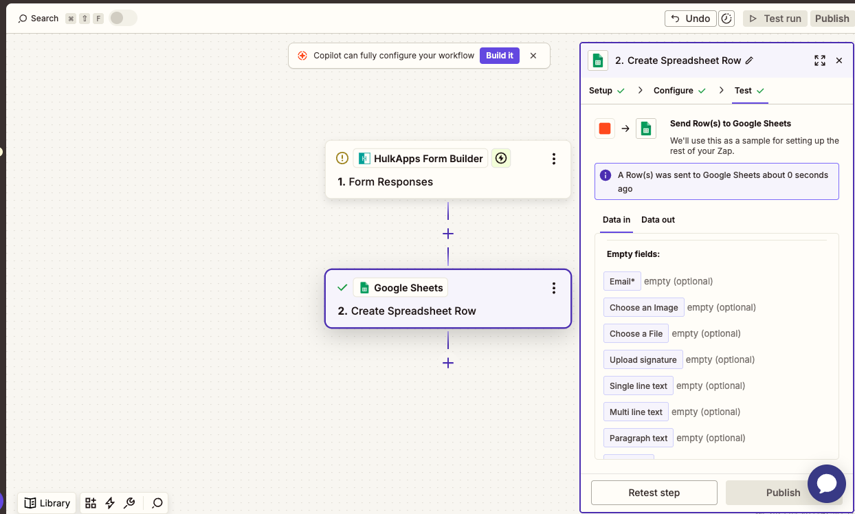 Check Zapier → Zaps to confirm that data is recorded in your chosen action app (e.g., Google Sheets).