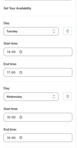 Next, set your weekly availability by choosing which days you're available and the specific working hours for each day. This gives you the flexibility to have different time windows on weekdays and weekends if needed.
