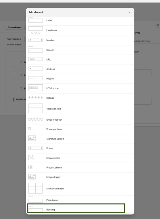 To get started, head over to the Form Builder section in your Shopify admin. Open an existing form or create a new one. In the Form Design tab, locate the Form Elements section. You’ll find the Booking element there — simply drag it onto your form.