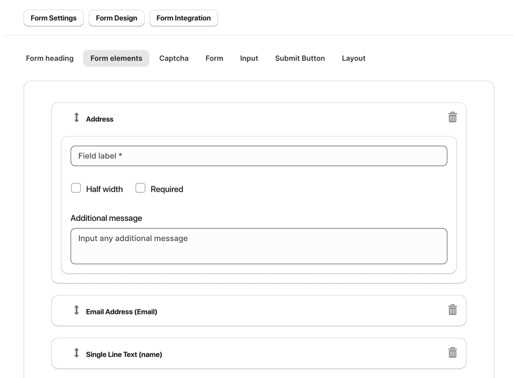 Use a pre-built Address field with a Country selection dropdown, City, Province, and Zip code are provided in text entry format.