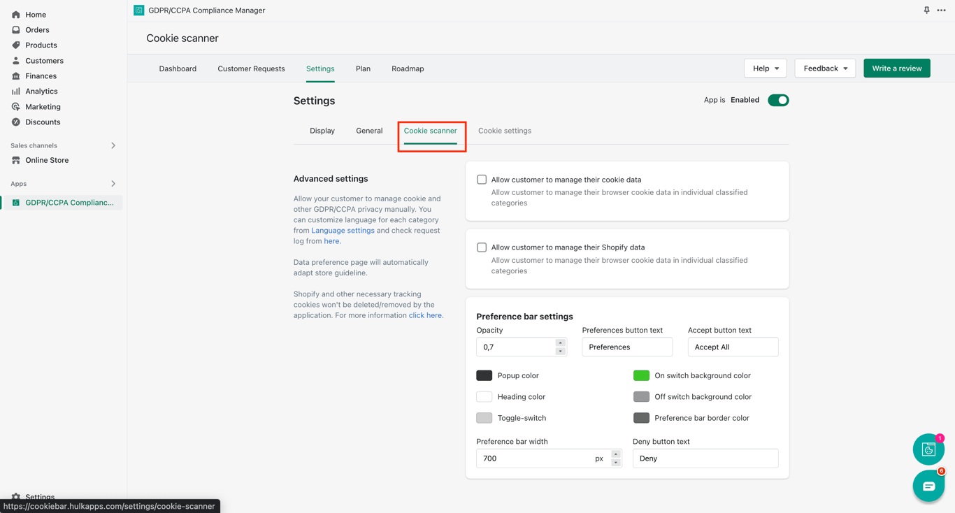 - Check the checkbox to "Allow customer to manage their cookie data" or/and "Allow customer to manage their Shopify data"