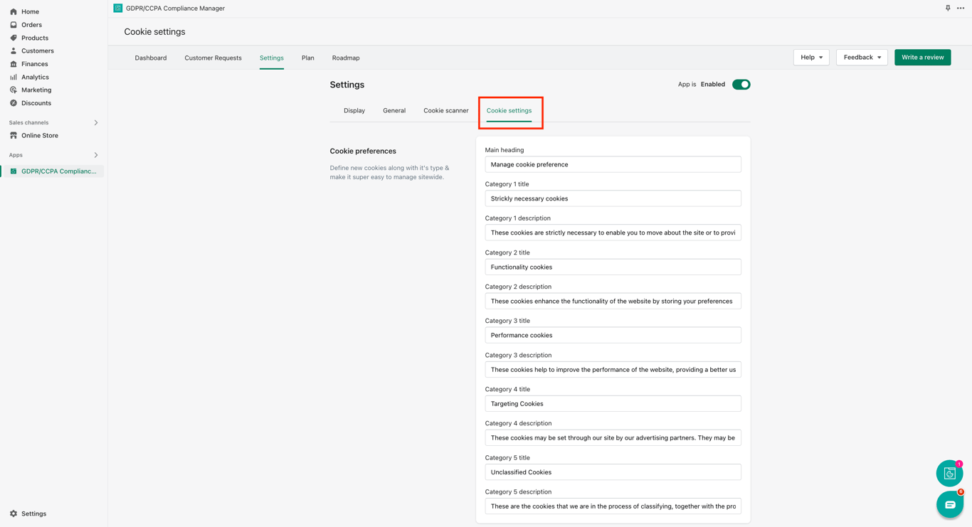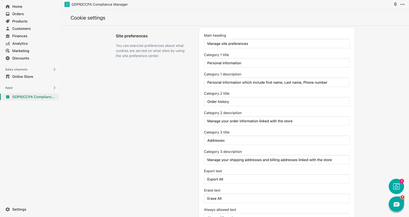 Customize the text of values that are displayed on the Data Preference page to your customer in your Shopify Store via Settings > Cookie settings tab.