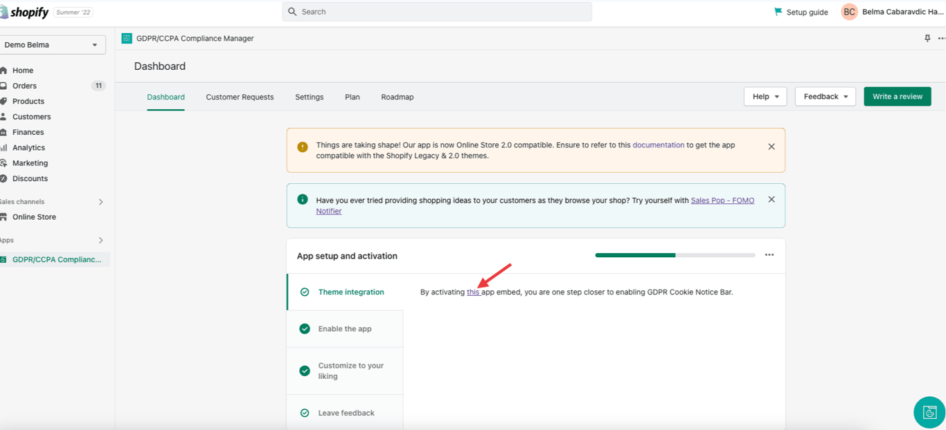 After installing our GDPR/CCPA Compliance Manager app, you need to enable it inside your store.