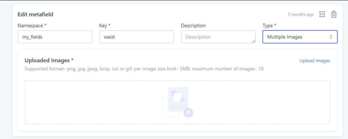 - As soon as you select the metafield type as Multiple images, you’ll be asked to upload the images. You can upload 10 images using one Multiple images metafield.