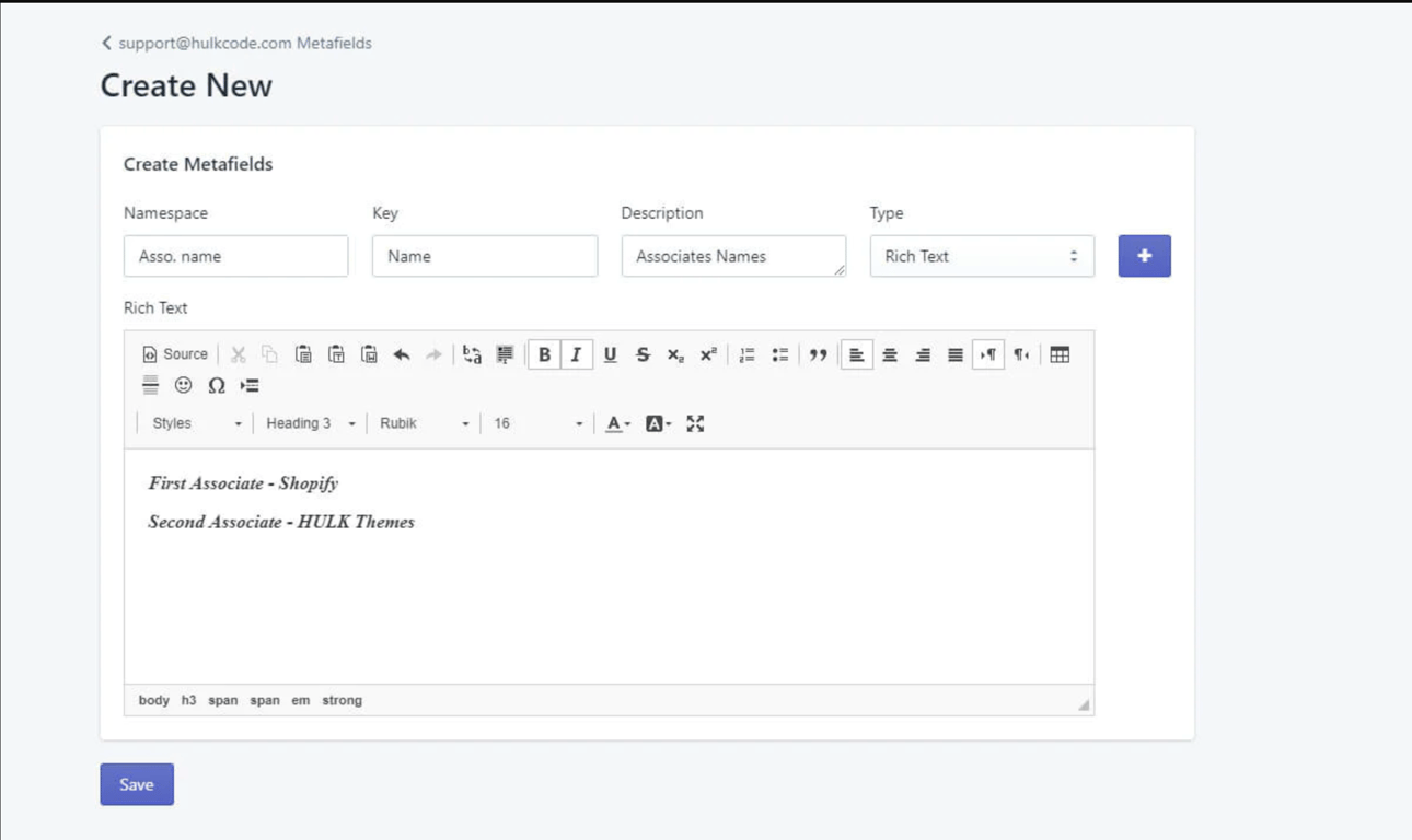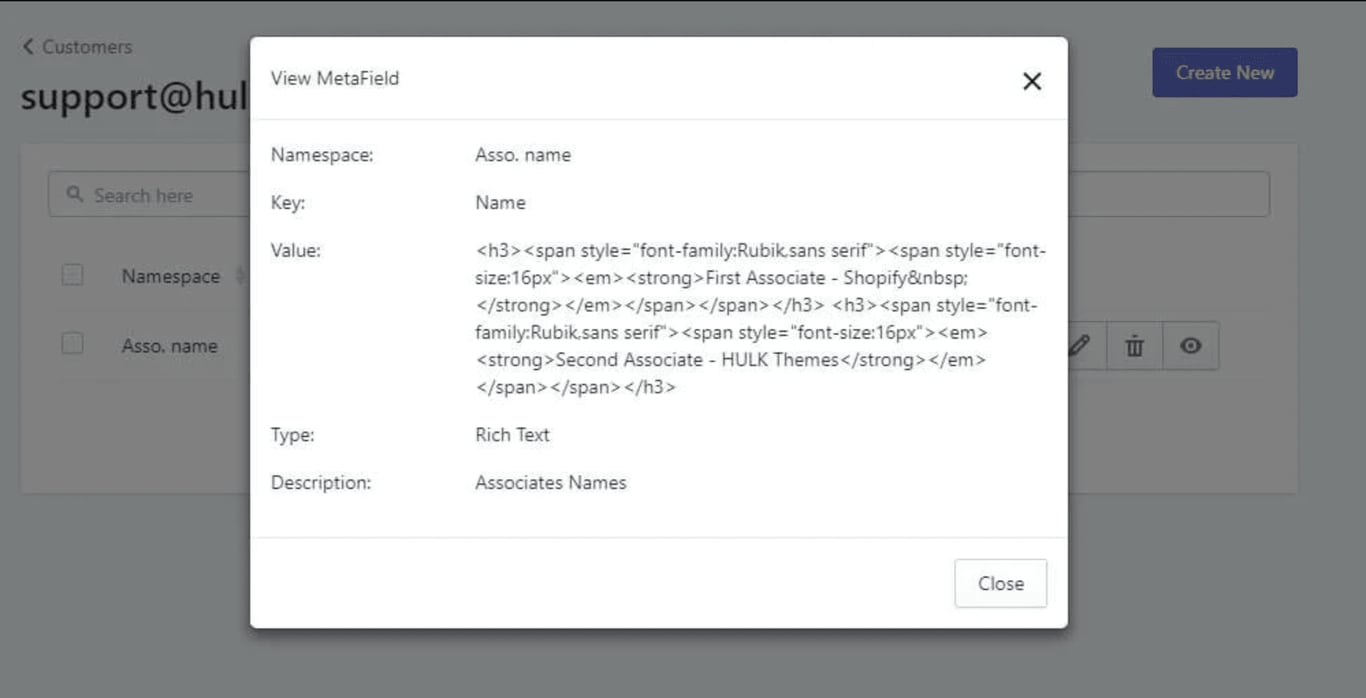 Created Metafield will look similar to this. Here the value is displayed in HTML format because the metafield type is Rich Text.