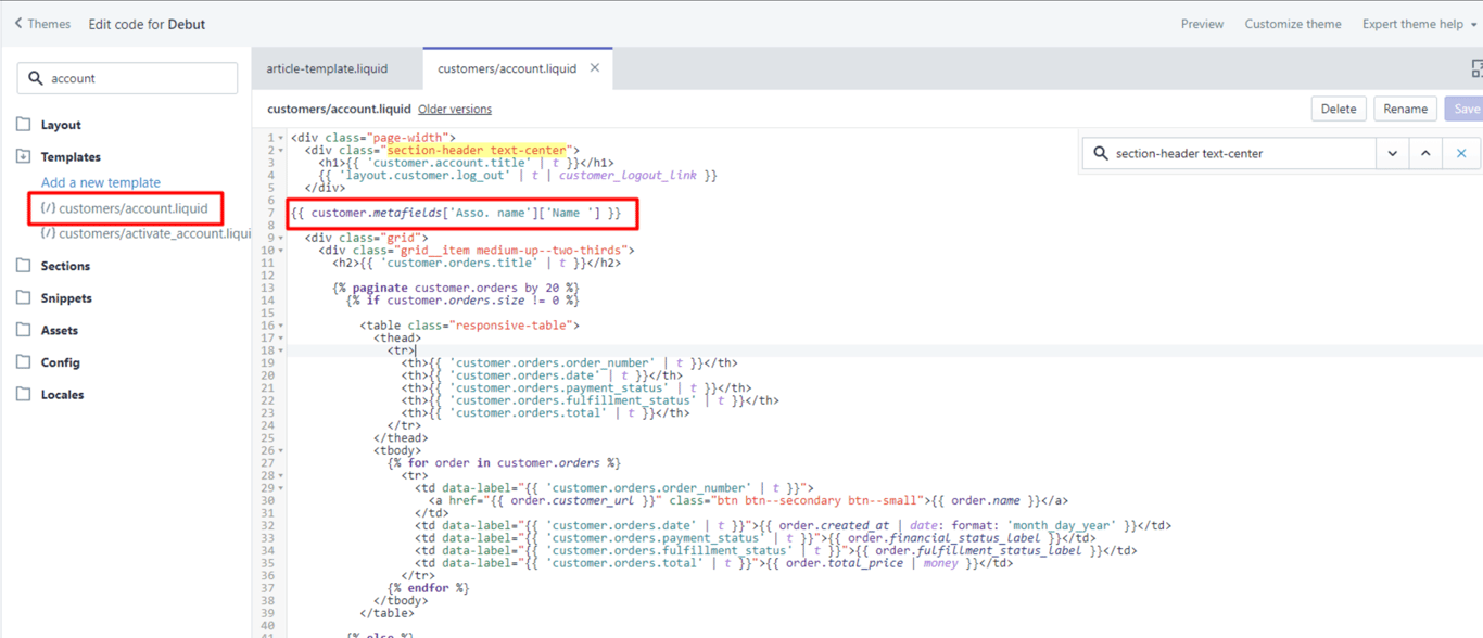Now under the ‘customer/account.liquid’ file of the Shopify store theme, Place the code where ever the metafield is meant to be displayed. In this example, the code is placed below the log-out button. Save the file.