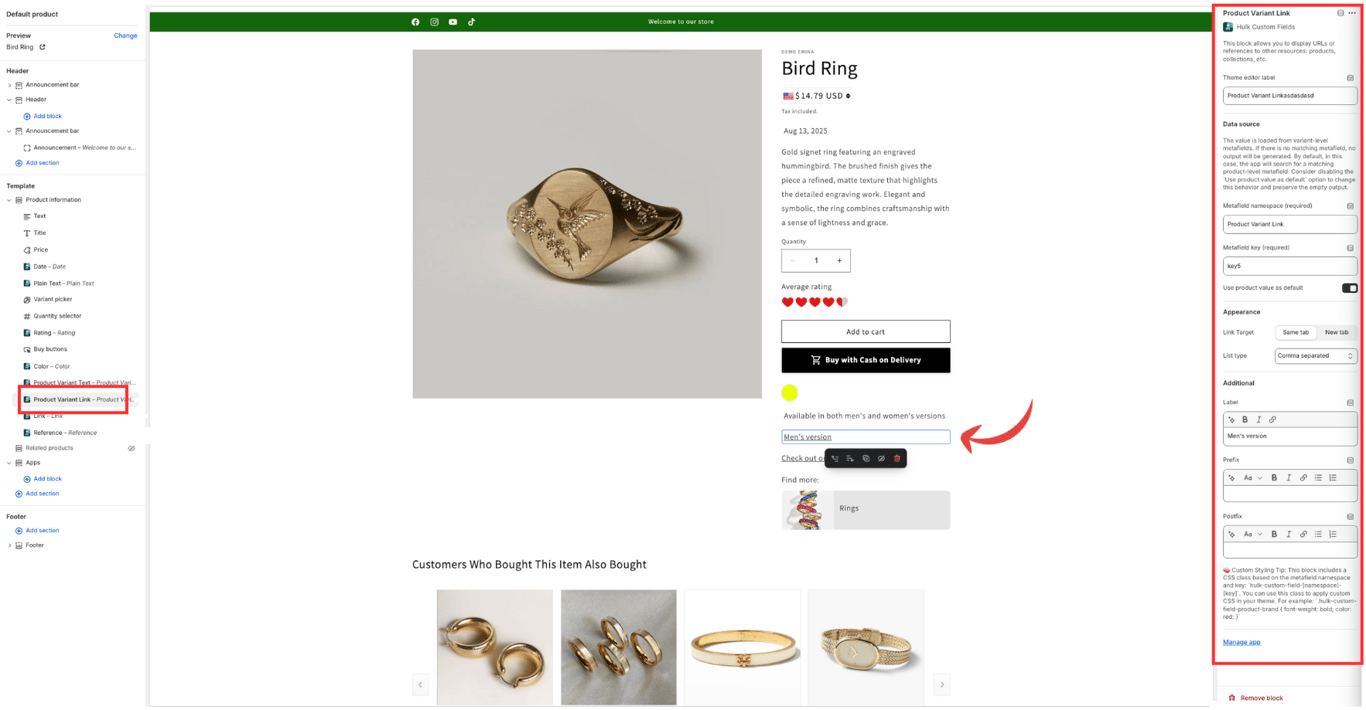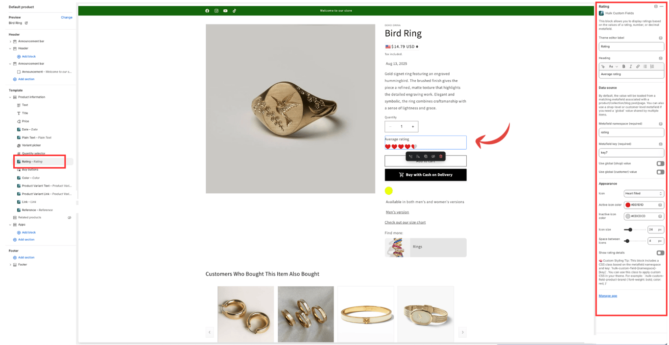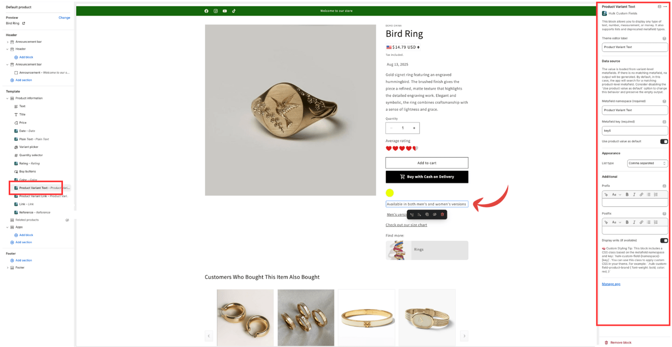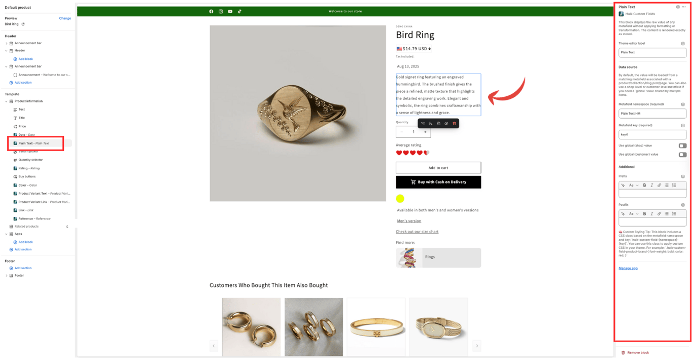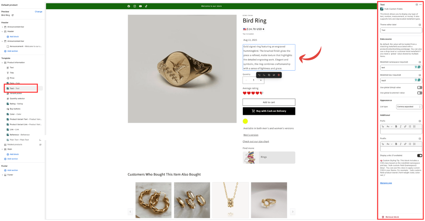 Once you’ve added a block to your theme, customize its settings to control how your metafield content is displayed. When you're satisfied with the layout and content, click "Save" to apply the changes to your storefront.