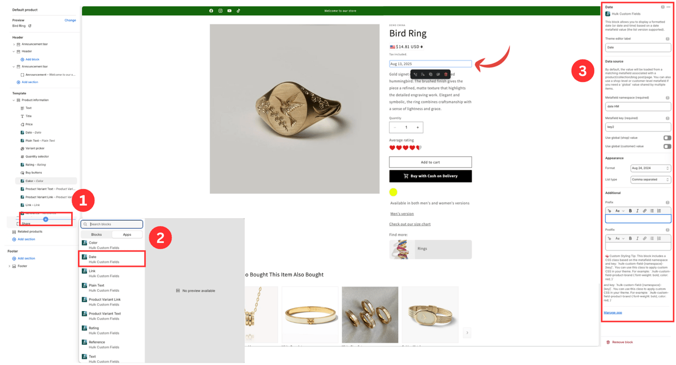 For the Date block example, the steps are exactly the same — just select the "Date" block instead of "Color" when adding it to your product template.