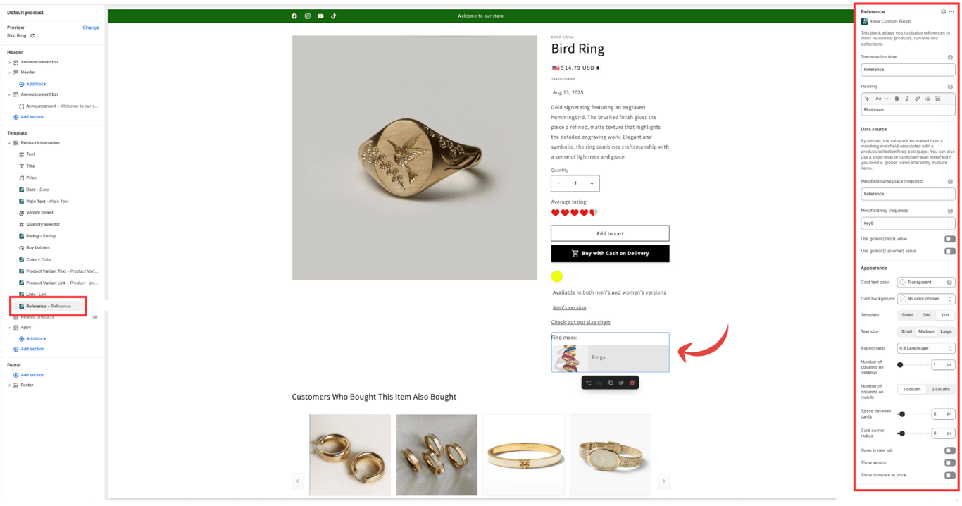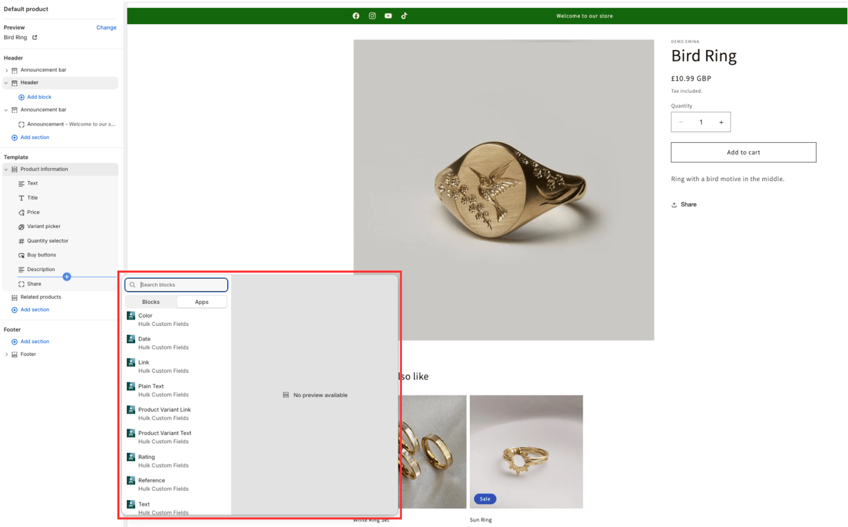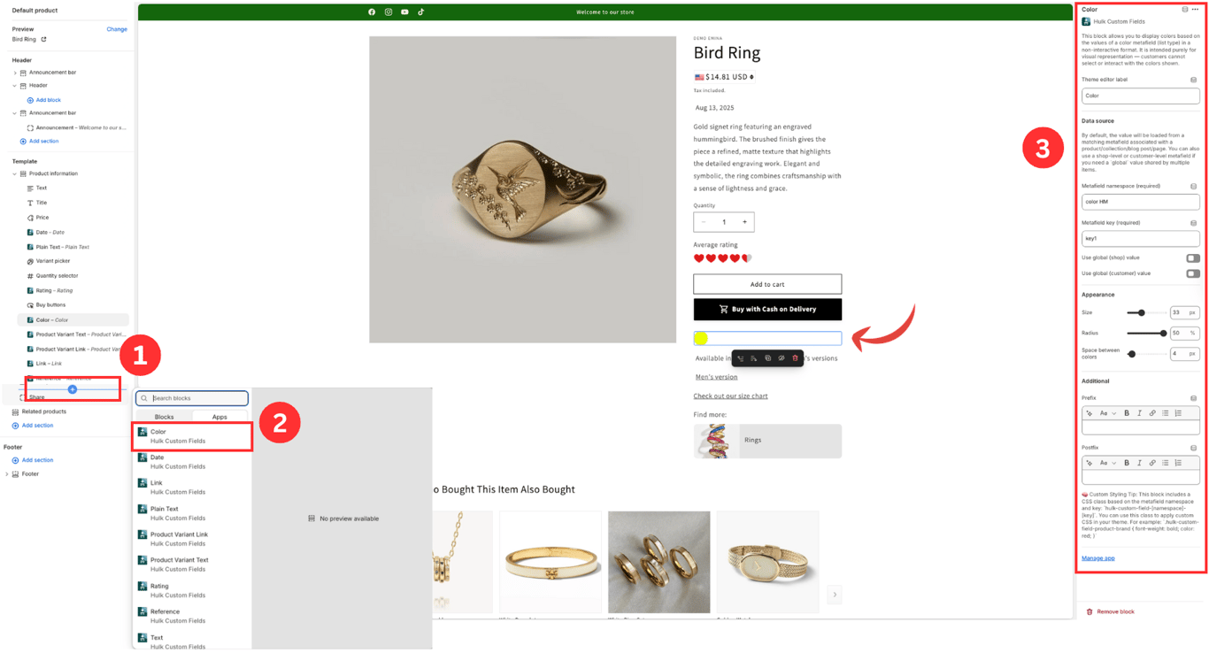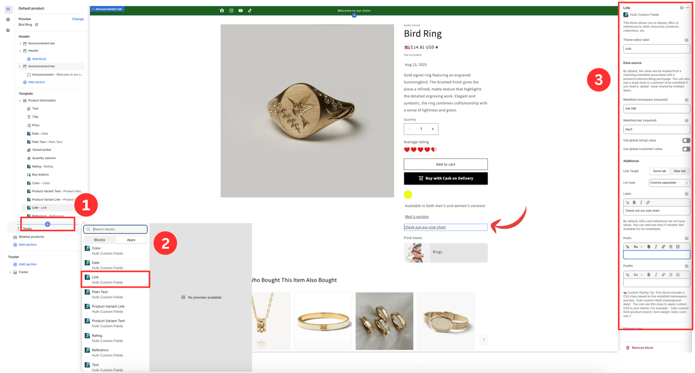 On the left side, under your product template structure, you can add a theme extension block. On the right side, you’ll find the customization panel where you can configure the block's settings.