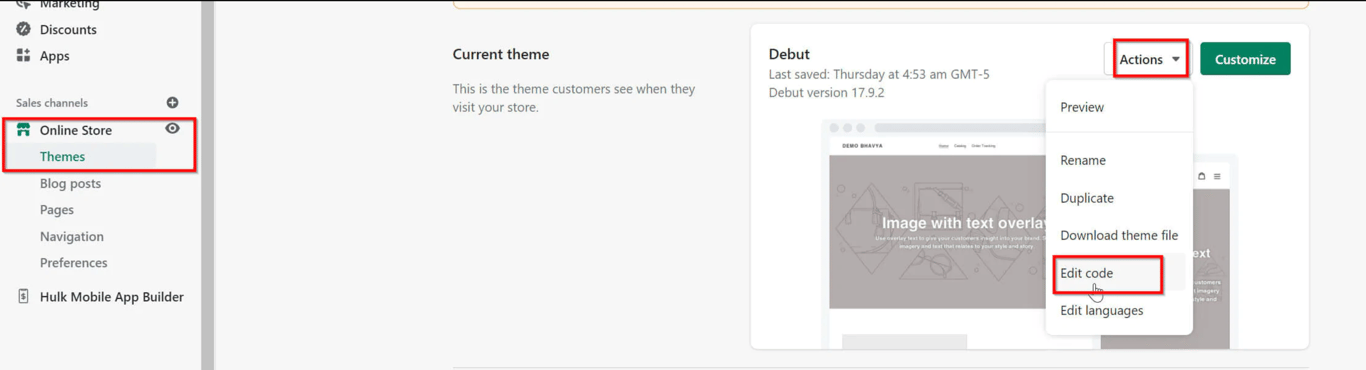 Now, navigate to the “Online Store” menu and look for the edit code option under the ‘Action’ dropdown option.