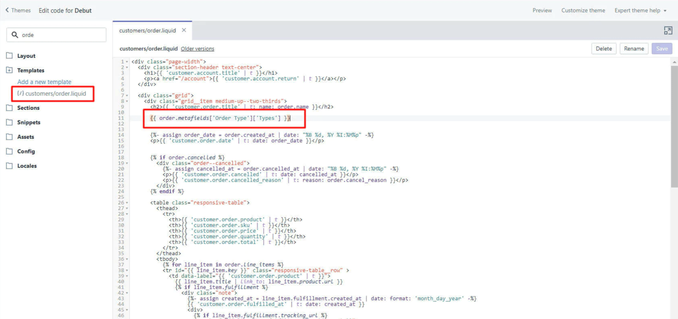 Now under the ‘customer/order.liquid’ file of the Shopify store theme, place the code where ever the metafield requires it to be displayed. In this example, the code is placed below the order number. Save the file.