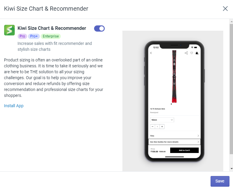 Make sure that the Kiwi Size Chart & Recommender app is installed in the Shopify store.