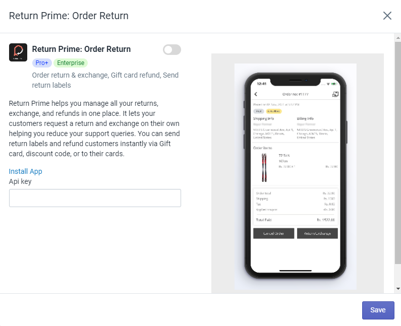 Navigate to the Hulk Mobile App Builder App > Settings > Integrations > Paste the created API token from the Return Prime:Order Returns app backend, and Enable the Integration.
