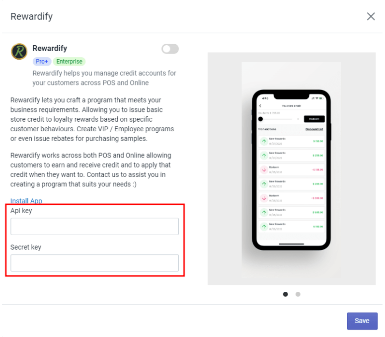 Navigate to the Hulk Mobile App Builder App > Settings > Integrations > Paste the created API Key and secret Key from the Rewardify app backend, Enable the Integration.