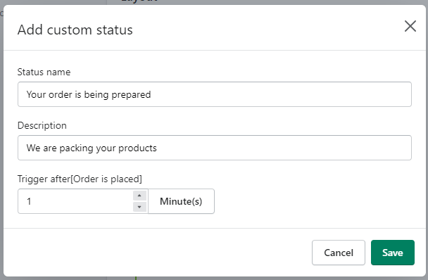 - While at the Add custom status pop-up, define your Status Name and its Description and add a timeframe if necessary (after how many minutes the status should appear in your order status).