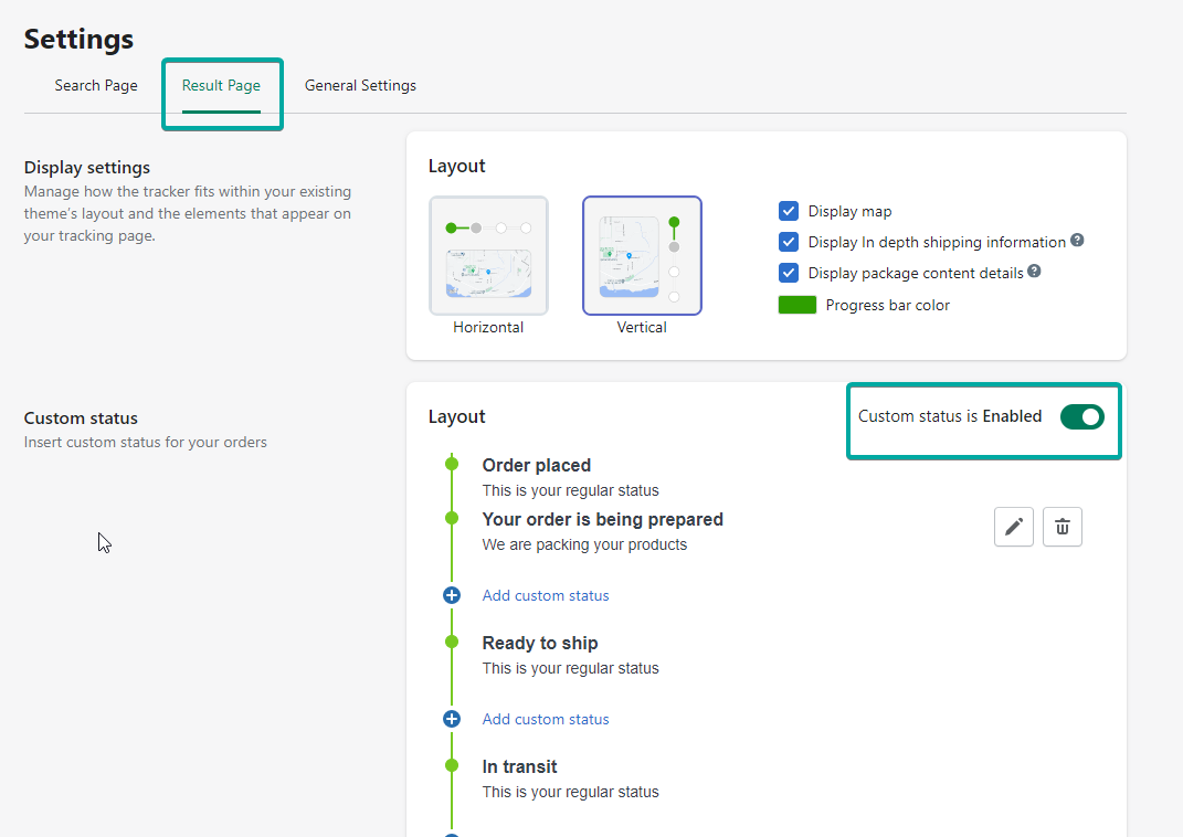 - Access the Shopify store admin, and navigate to Apps> Order Status Tracker> Settings> Result Page.