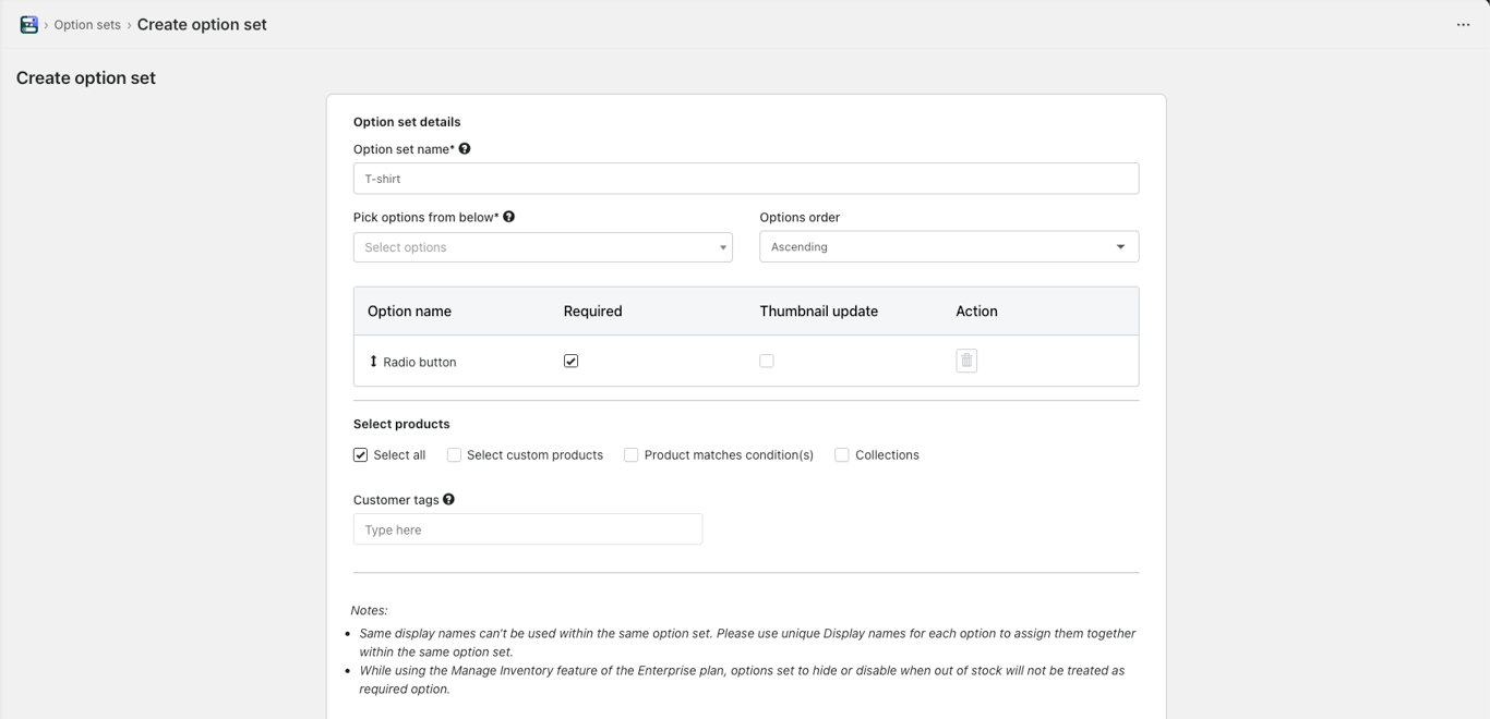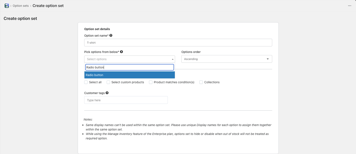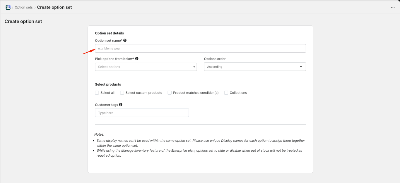 - Next, add an Option Set Name — this is for internal reference only and will not be visible to customers.