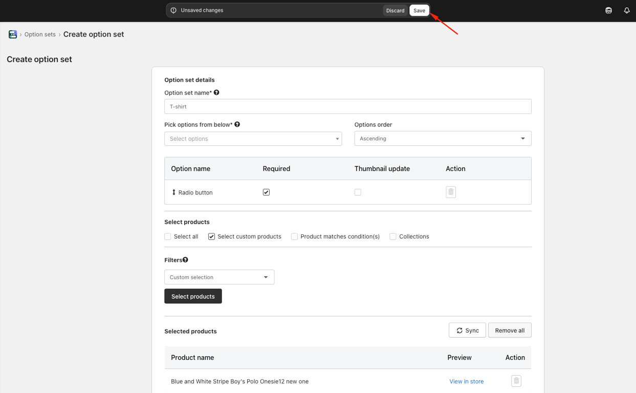 Note: If products are not visible under Custom Selection, ensure that the products are Active and not in Draft status in the store. - Finally, click Save an Option Set to make the assigned options visible on the selected products in your store.