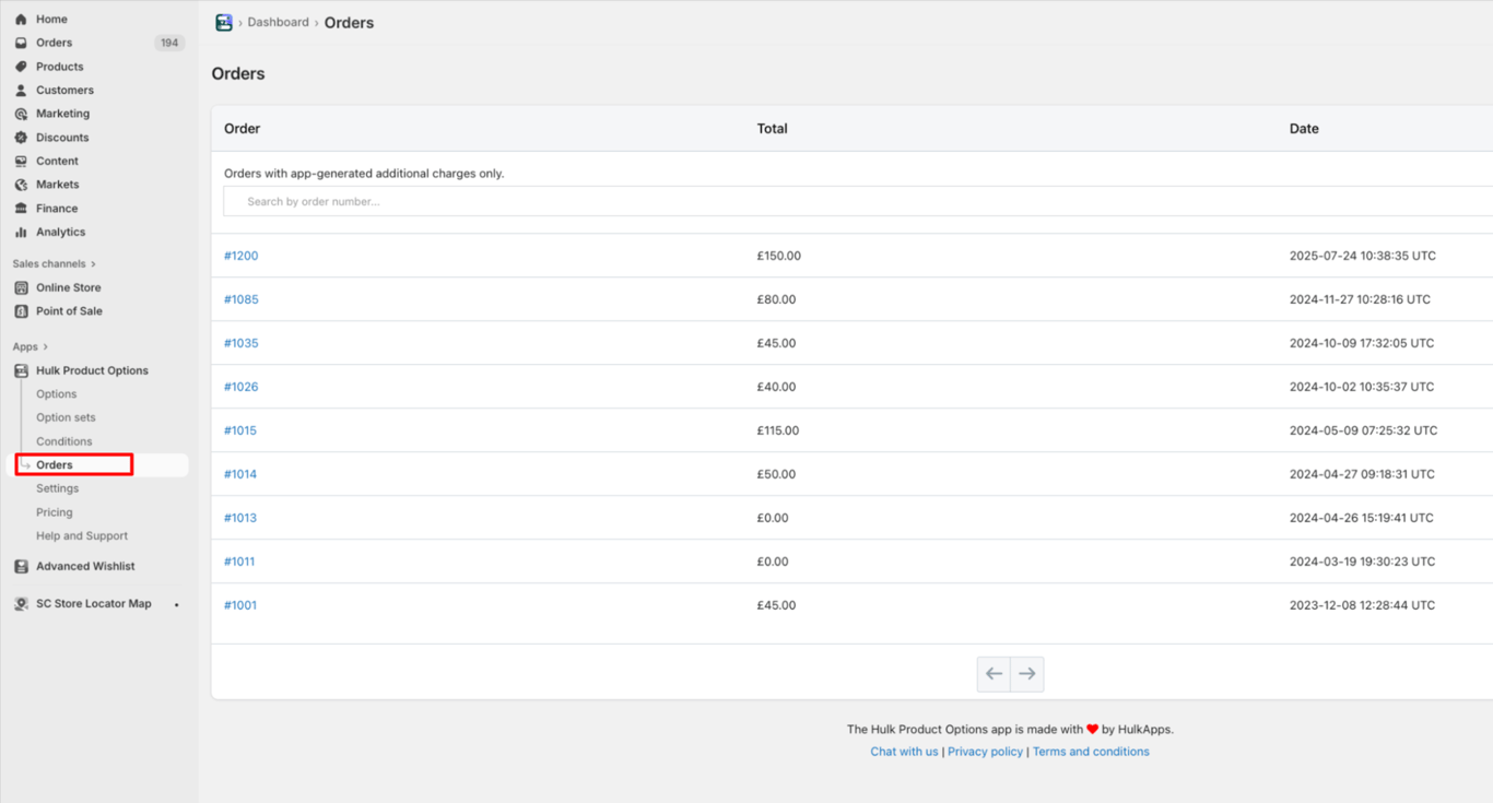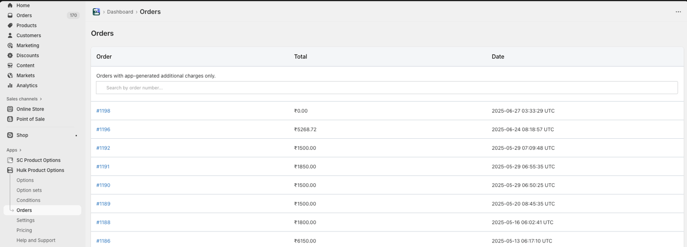 Orders View order details showing products with add-on options and charges, the revenue from the order, and the order date.
