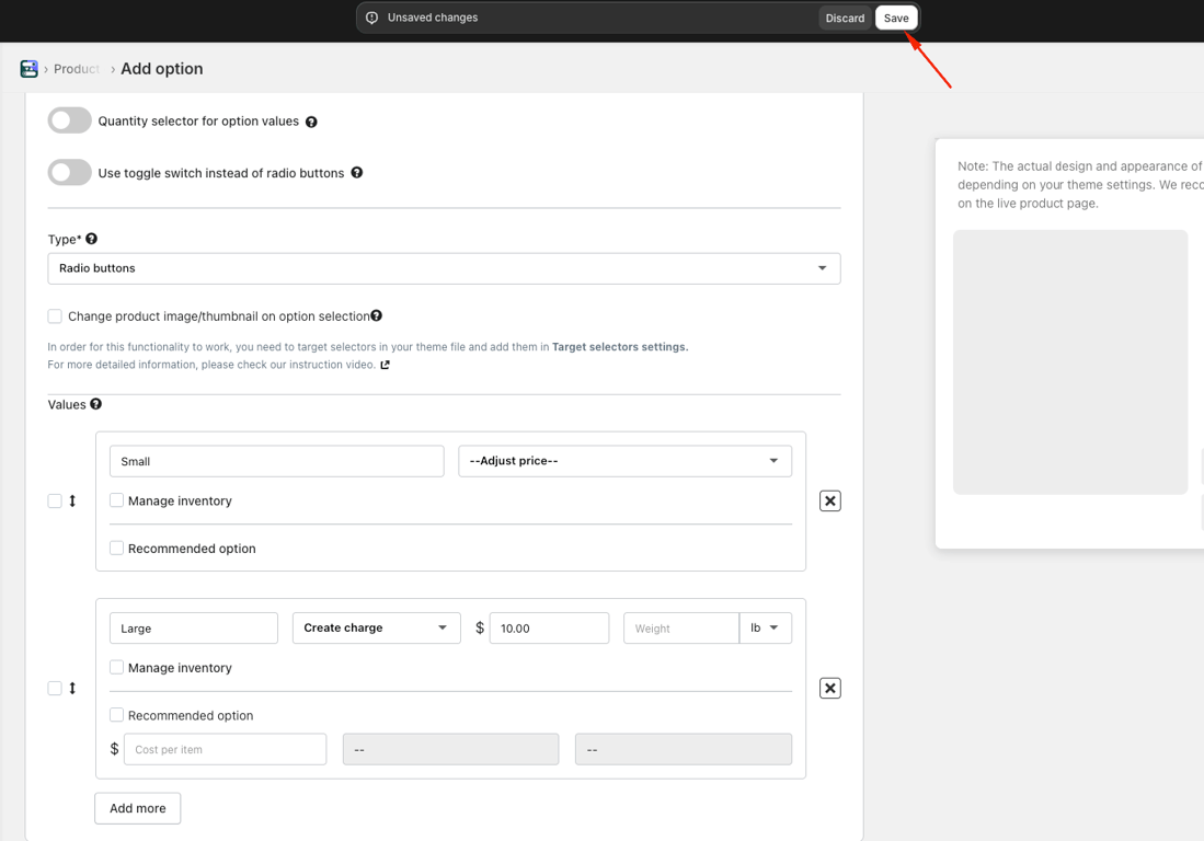- After selecting the Option Type, add the corresponding Option Values — for example, Small, Large, or any values you’d like to offer for customers to choose from.