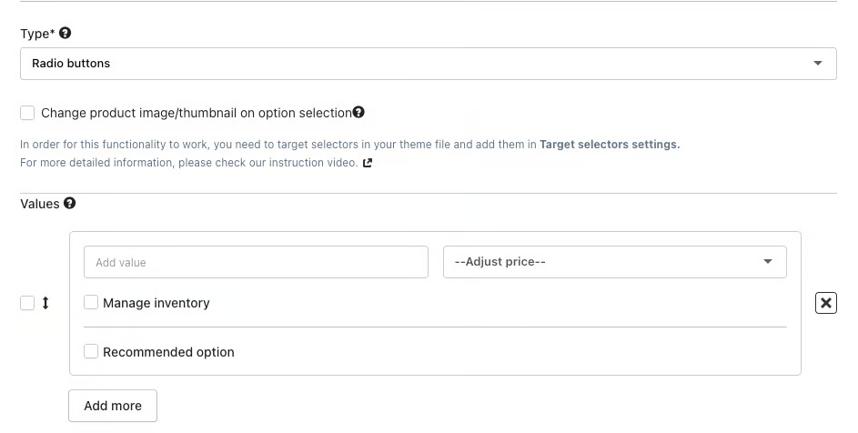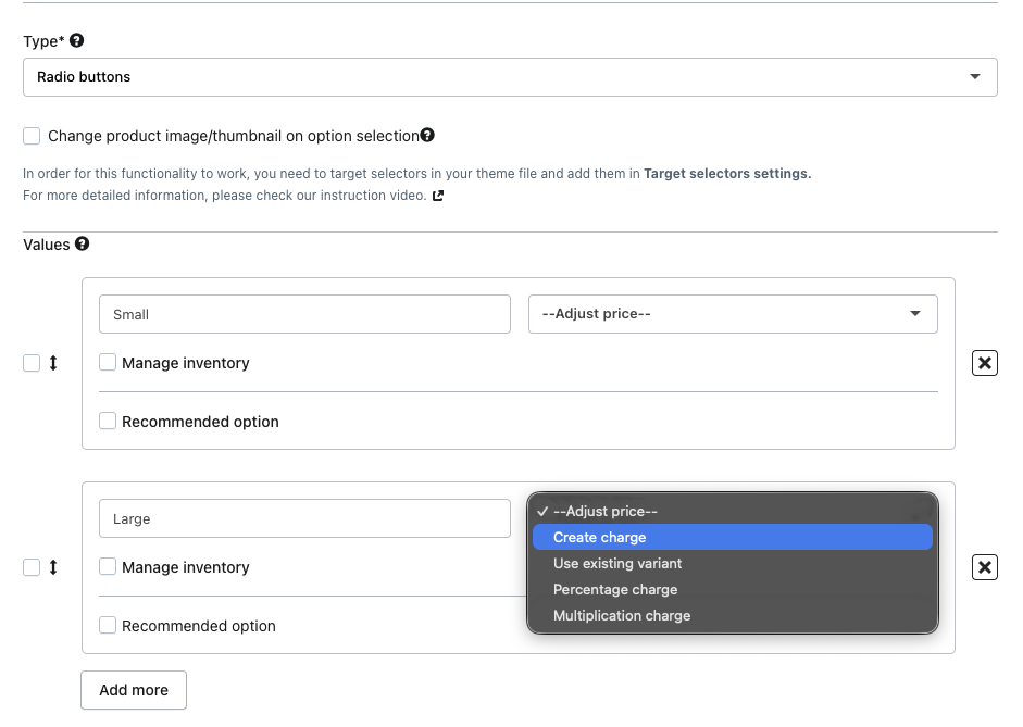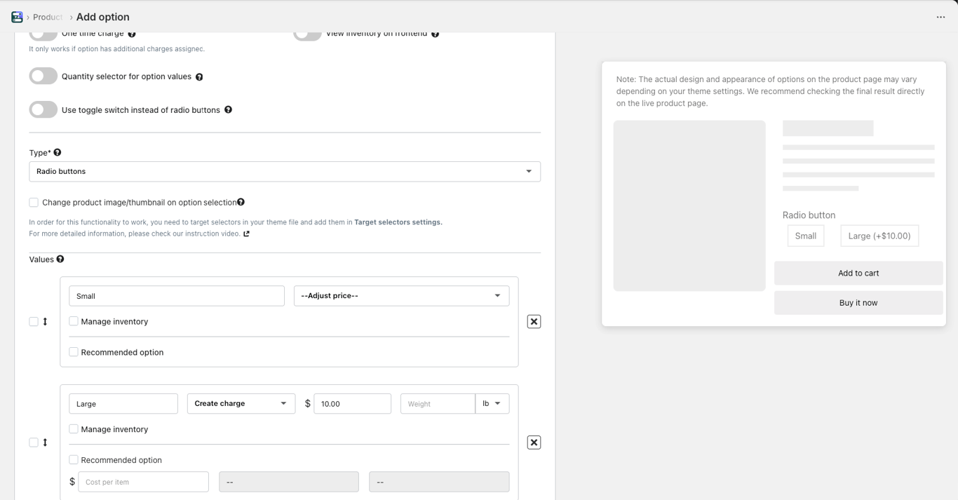 - Values can be added directly, or additional charges can be applied to specific values — for example, the Large option can include an extra add-on cost added in addition to the product price.