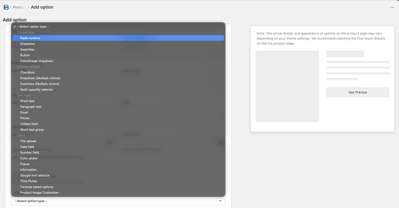 - Next, choose the appropriate Option Type (e.g., Radio Buttons, Swatches, Dropdown, Checkbox, and more).