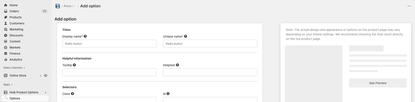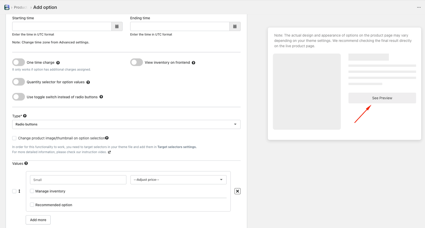 - This will display how the options will appear on the product page once the created option is assigned to an Option Set, as explained later in this article.