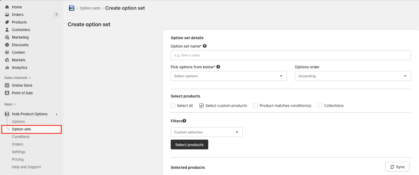 Once options are created, option sets must be created to assign the options to all or selected products in the Shopify store.