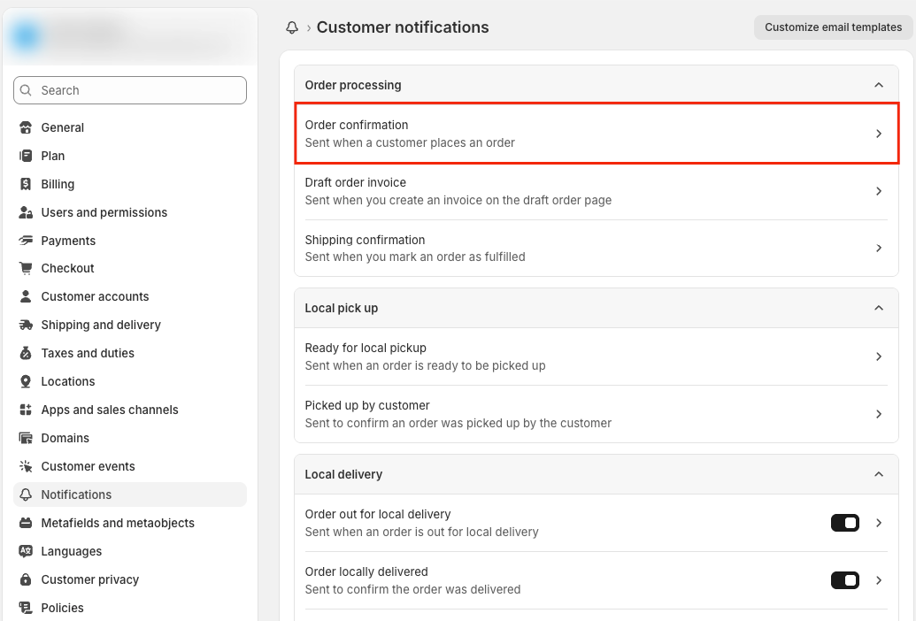 Step 3: Click on Order confirmation under the “Customer Notifications” section.